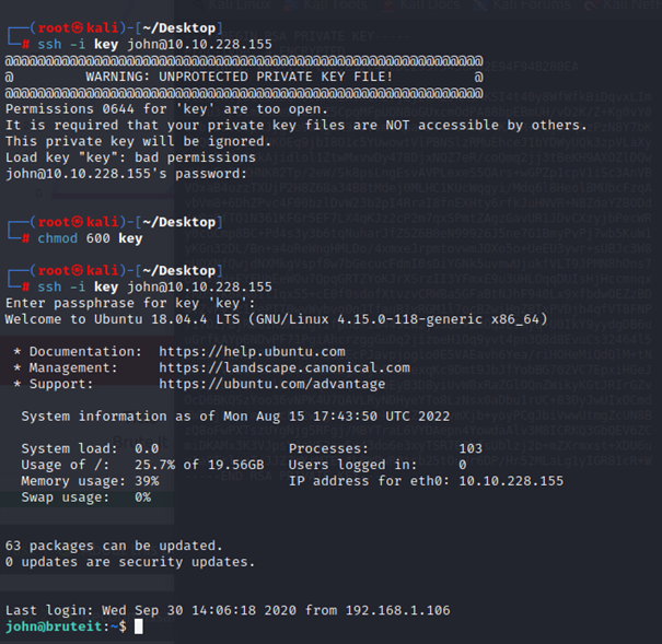 - Ssh ile john kullanıcısına bağlanmayı denedim. İlk denememde “UNPROTECTED PRIVATE KEY FILE” uyarısı aldım. Chmod ile private key dosyasına yetki verdim ve yeniden ssh ile bağlanmayı denedim. John ile bulduğum şifreyi girdim ve bağlandım.